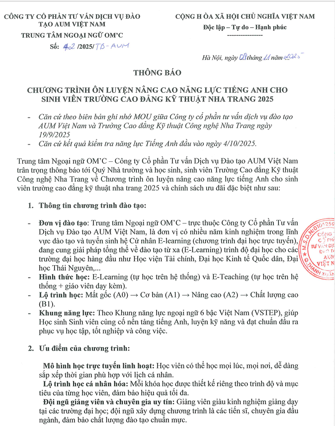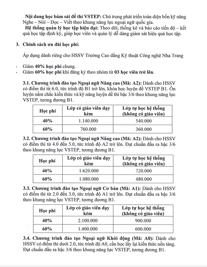 CHƯƠNG TRÌNH ÔN LUYỆN NÂNG CAO NĂNG LỰC TIẾNG ANH CHO SINH VIÊN TRƯỜNG CAO ĐẲNG KỸ THUẬT CÔNG NGHỆ NHA TRANG 2025