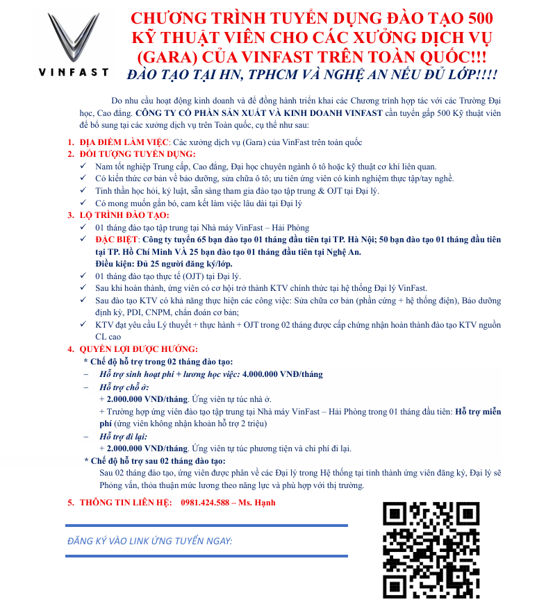 Làm việc tại: Các xưởng dịch vụ (Gara) của VinFast trên toàn quốc.