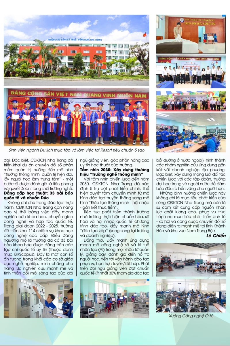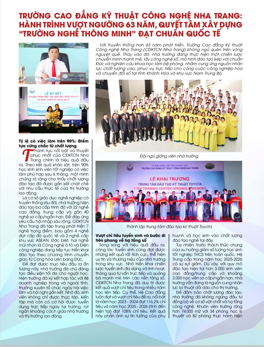 Hành trình ấy vinh dự được Tạp chí Truyền thống & Phát triển ghi nhận trong chủ đề “Khánh Hòa – Tiềm năng và Điểm đến”, như một minh chứng cho vai trò của giáo dục nghề nghiệp trong phát triển nguồn nhân lực chất lượng cao, góp phần xây dựng Khánh Hòa năng động, hội nhập và bền vững.