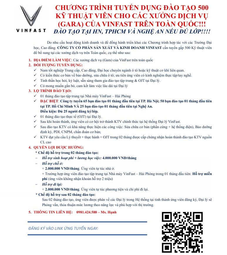 VINFAST TUYỂN DỤNG – ĐÀO TẠO 500 KỸ THUẬT VIÊN DỊCH VỤ (GARA) TRÊN TOÀN QUỐC